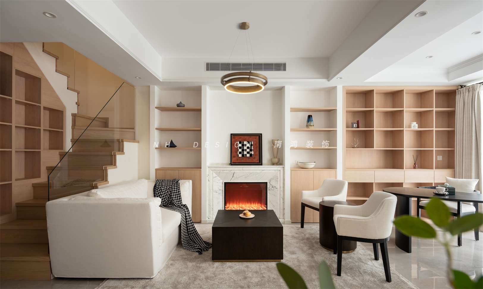 客厅包容了主人的办公区,并通过整墙书柜与壁炉的搭配,实现阅读、休闲、社交等多重功能,视线在横向维度上同步得到延展。