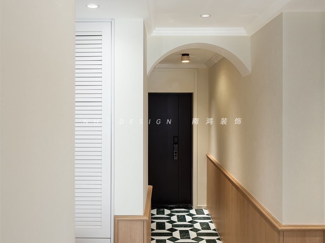 入户门厅的地面做了绿色大理石的水刀拼花工艺,天然石材的流动纹理通过精密切割、组合,塑造了极富张力的艺术构图。拱形半门洞设计,以柔和曲线形态完成玄关到室内的过渡,进一步强化了室内外转换的仪式感。