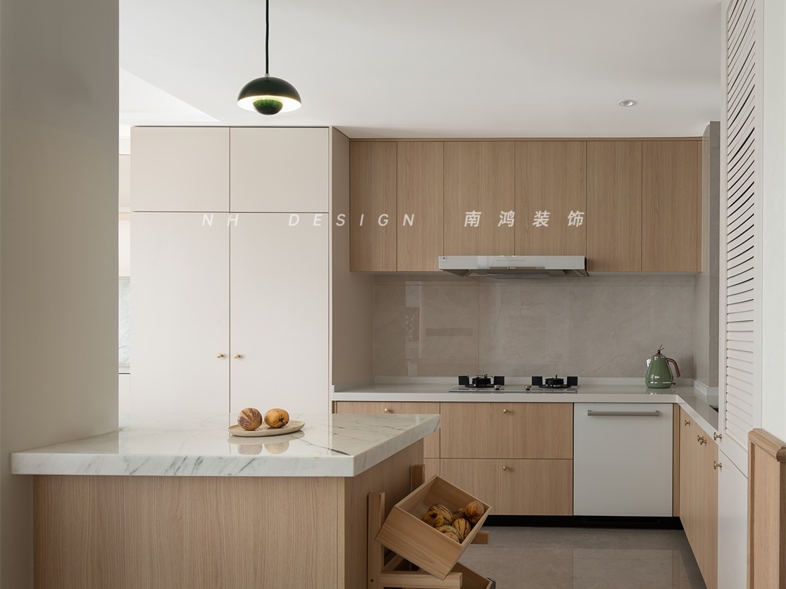 开放式餐厨区以承重柱为轴心展开了设计,延伸出的岛台既化解了结构限制,又巧妙拓展出备餐区、早餐吧等实用功能。不加阻隔的联通布局让自然光在空间内自由流动,亲友共聚时,烹饪、用餐与声声谈笑皆成一体。