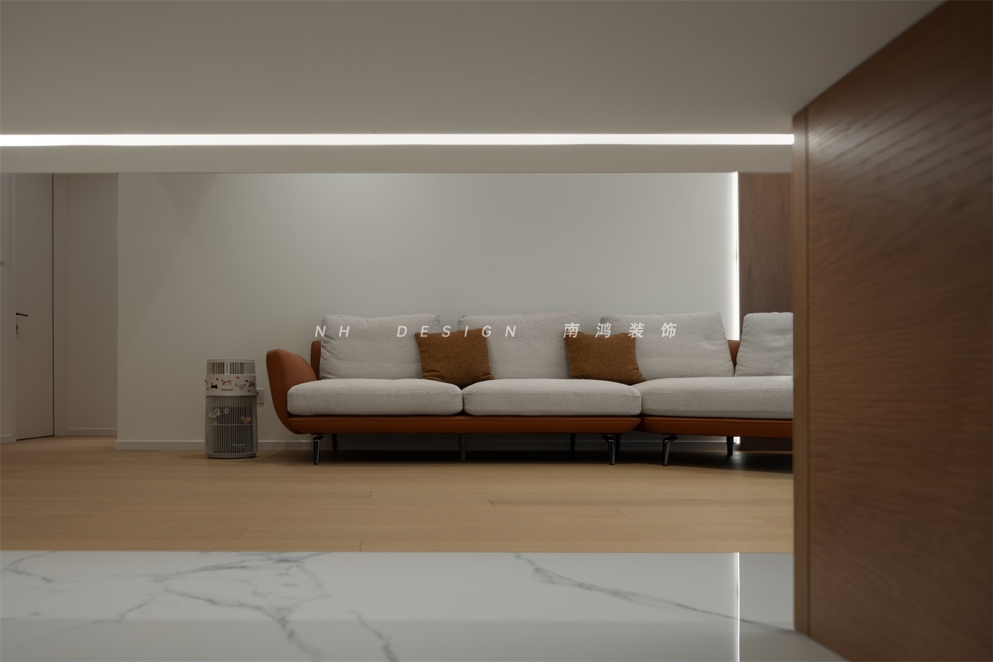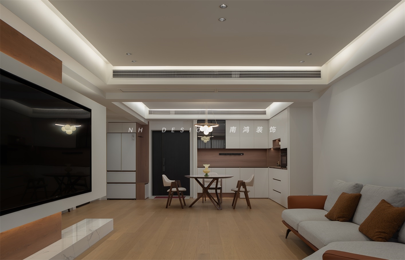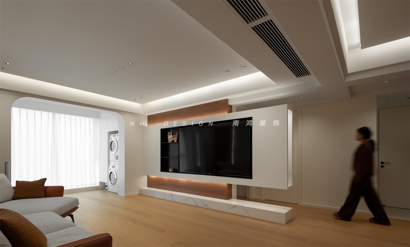 客厅电视背景墙以悬浮矩形姿态呈现,轻盈地塑造出高级感,并与过道进行了趣味的结合,令公区域的通透性得到极大增强。