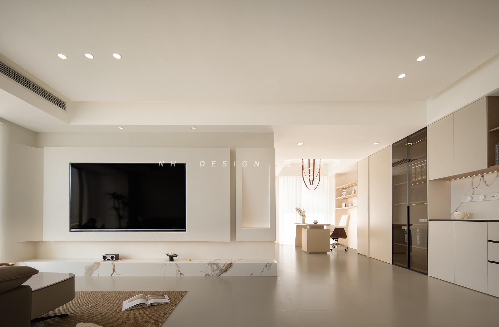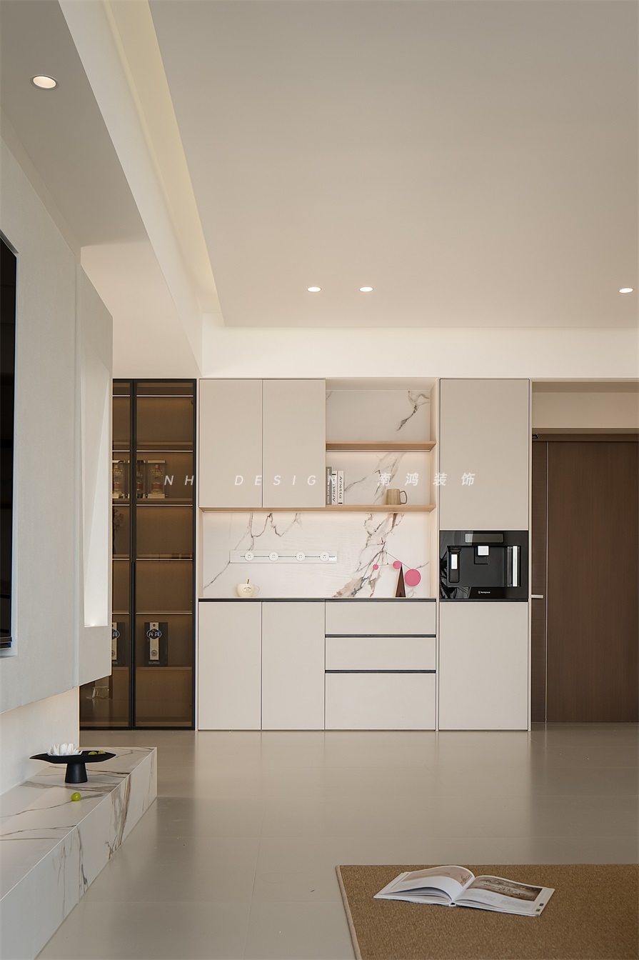 电视墙接续极简语言,大面积留白做基底,通过弧形曲面、悬浮结构与体块分割的组合,构建出轻盈而优雅的空间表情。