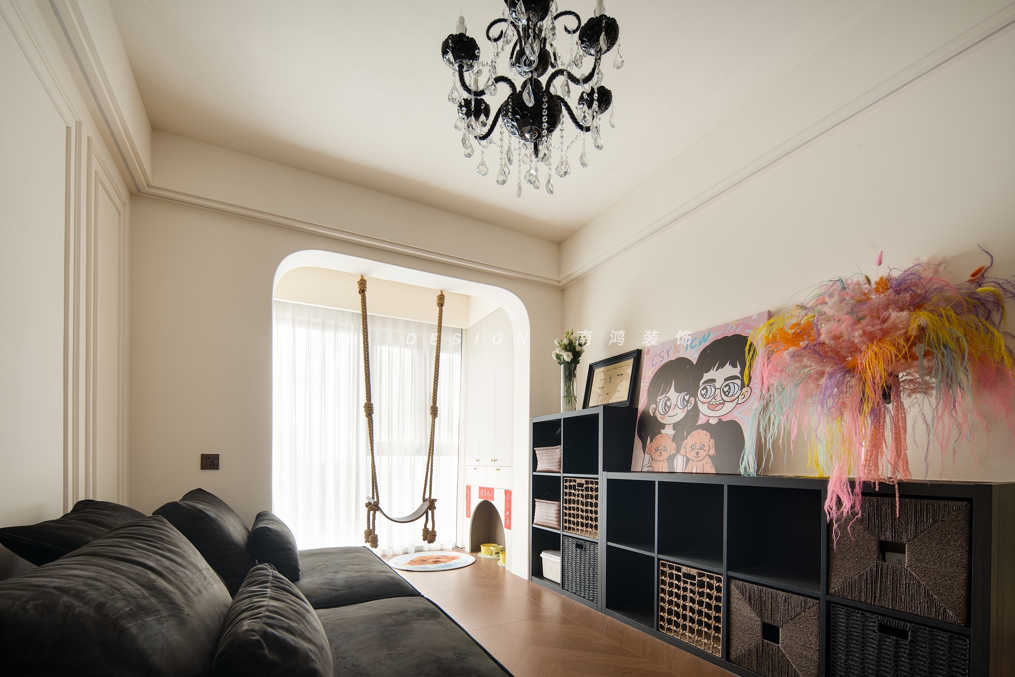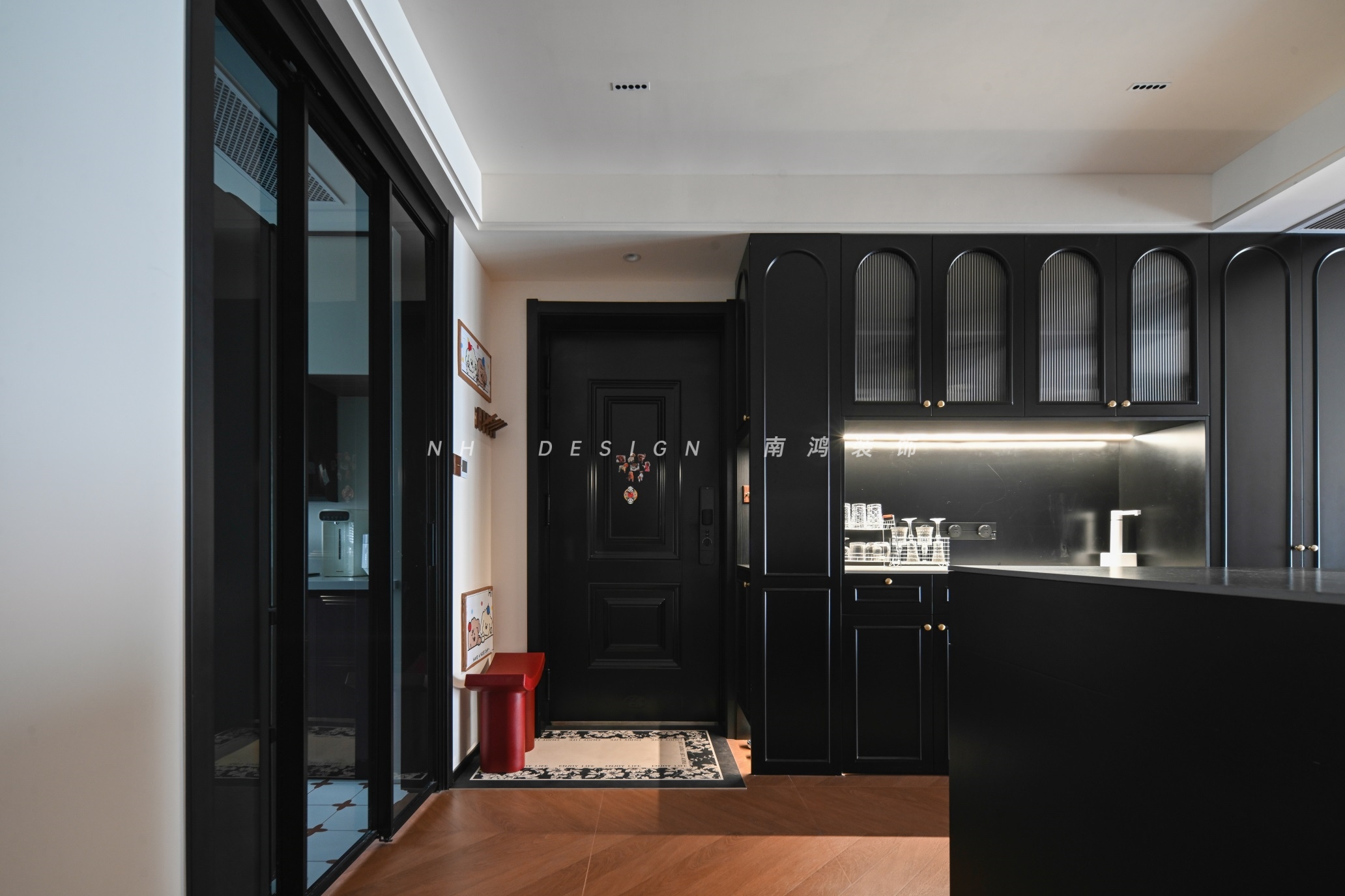 玄关是家的第一道风景,也是情绪转换的微妙空间。萌宠元素的点缀,让主人在推门的刹那,便能瞬间被温情治愈。功能布局上,玄关柜的中部镂空区供放置钥匙、手包,底部悬空区方便换放鞋履。点睛之笔是那抹红色换鞋凳,打破单调的同时增强了归家仪式感;墙面增设木制挂衣钩,外套围巾也各得其所。