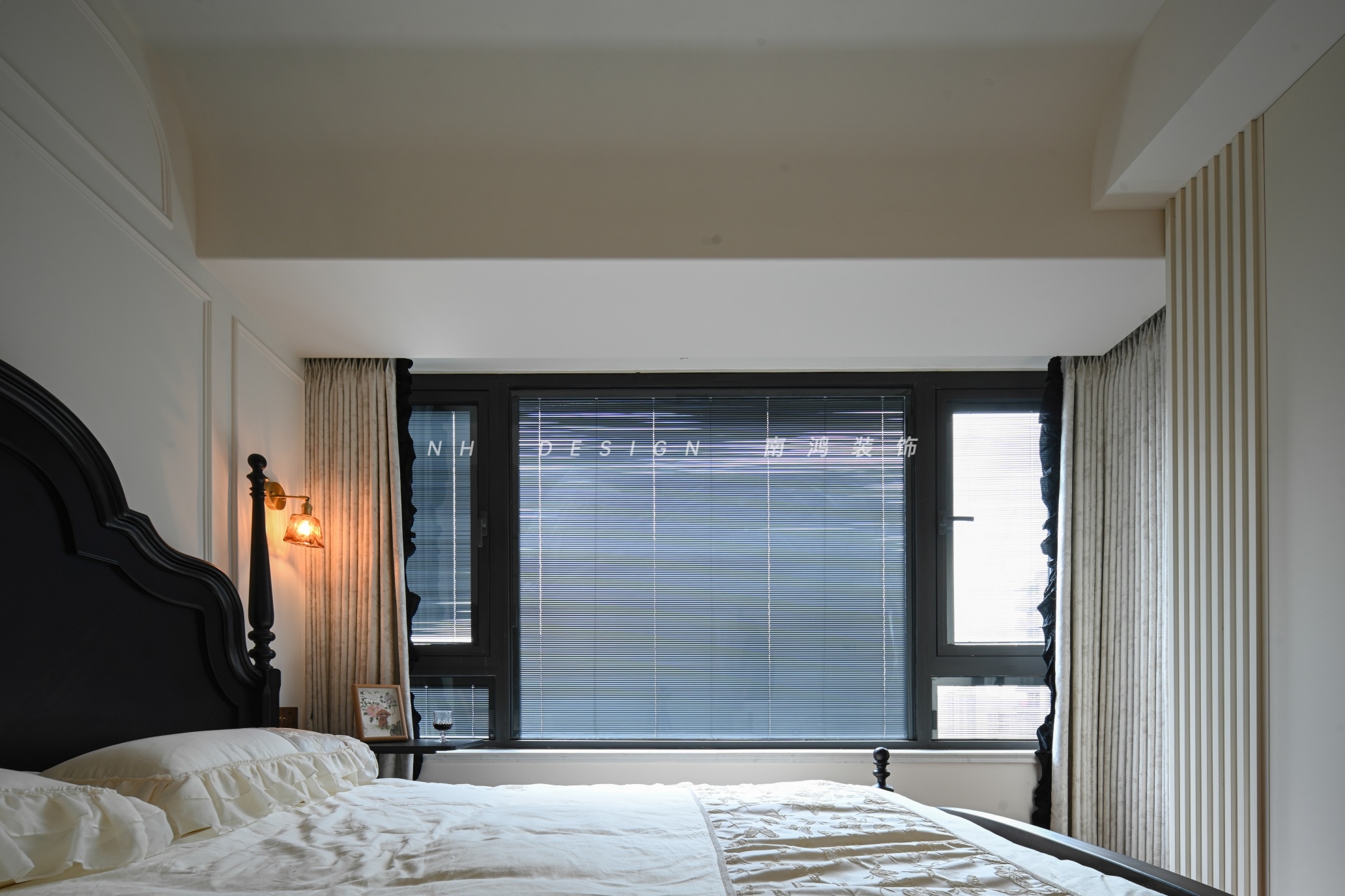 主卧选配黑色复古风的床具、床头柜,墙面同样以PU线条装饰,黄铜壁灯在奶油色墙面上投射出温暖光晕,渲染一方生活与艺术相融的优雅之景。