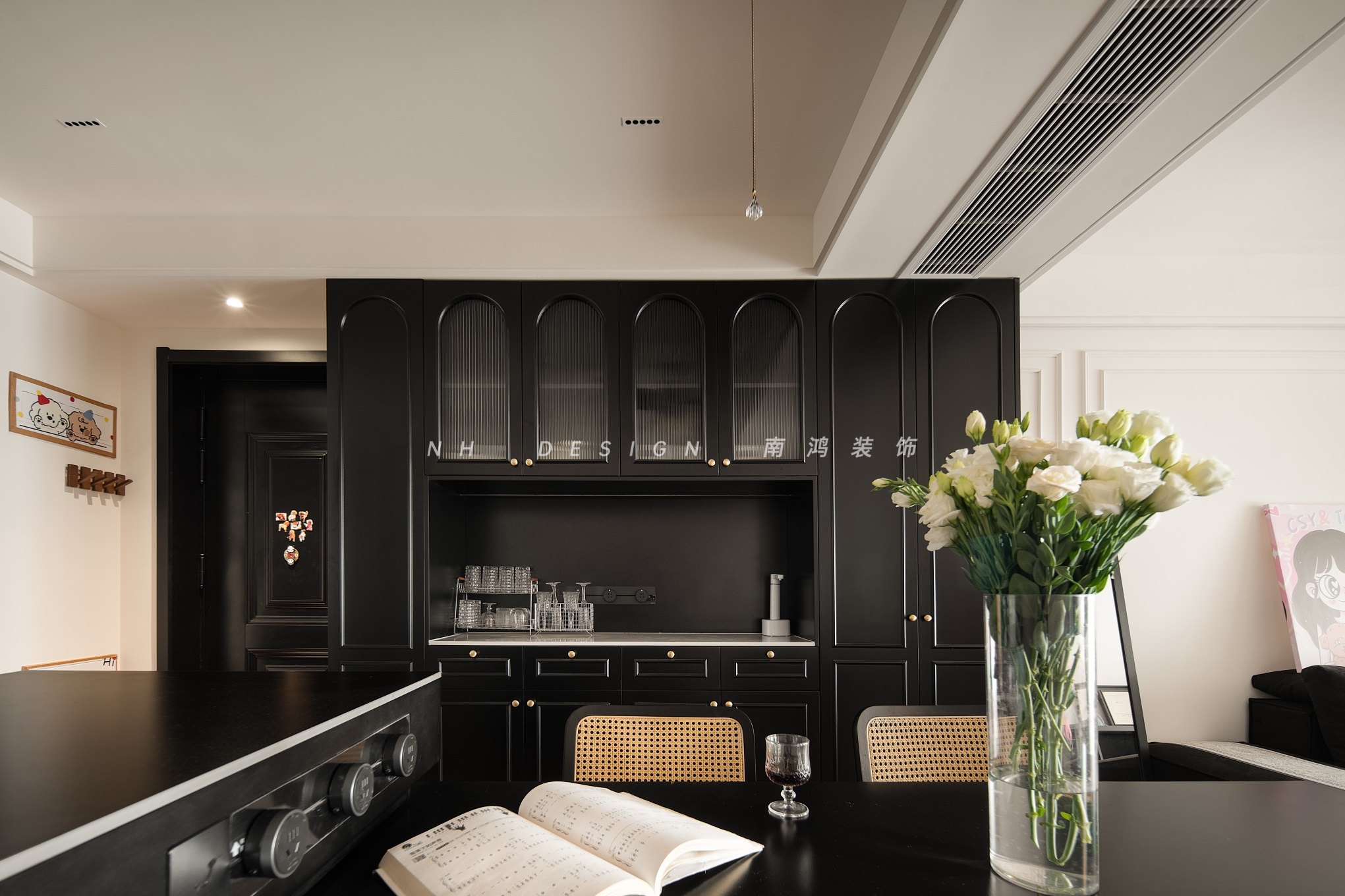 黑色餐边柜加以线条勾勒外型,搭配金属拉手与长虹玻璃,显得更加精致美观。中段嵌入式操作区,既能满足杯盏餐具与小电器的收纳需求,又以虚实相生的手法以及灯带的处理,增强了空间的通透感受。