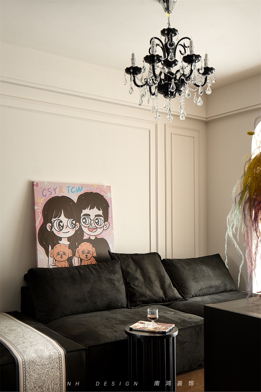 客厅舍弃了传统电视机的模式,取而代之的是一排黑色中古矮柜,既方便日常收纳,又散发出经久不衰的摩登质感。墙面留白,佐以线条勾勒,顶面配水晶吊灯,浓郁了一室复古氛围。