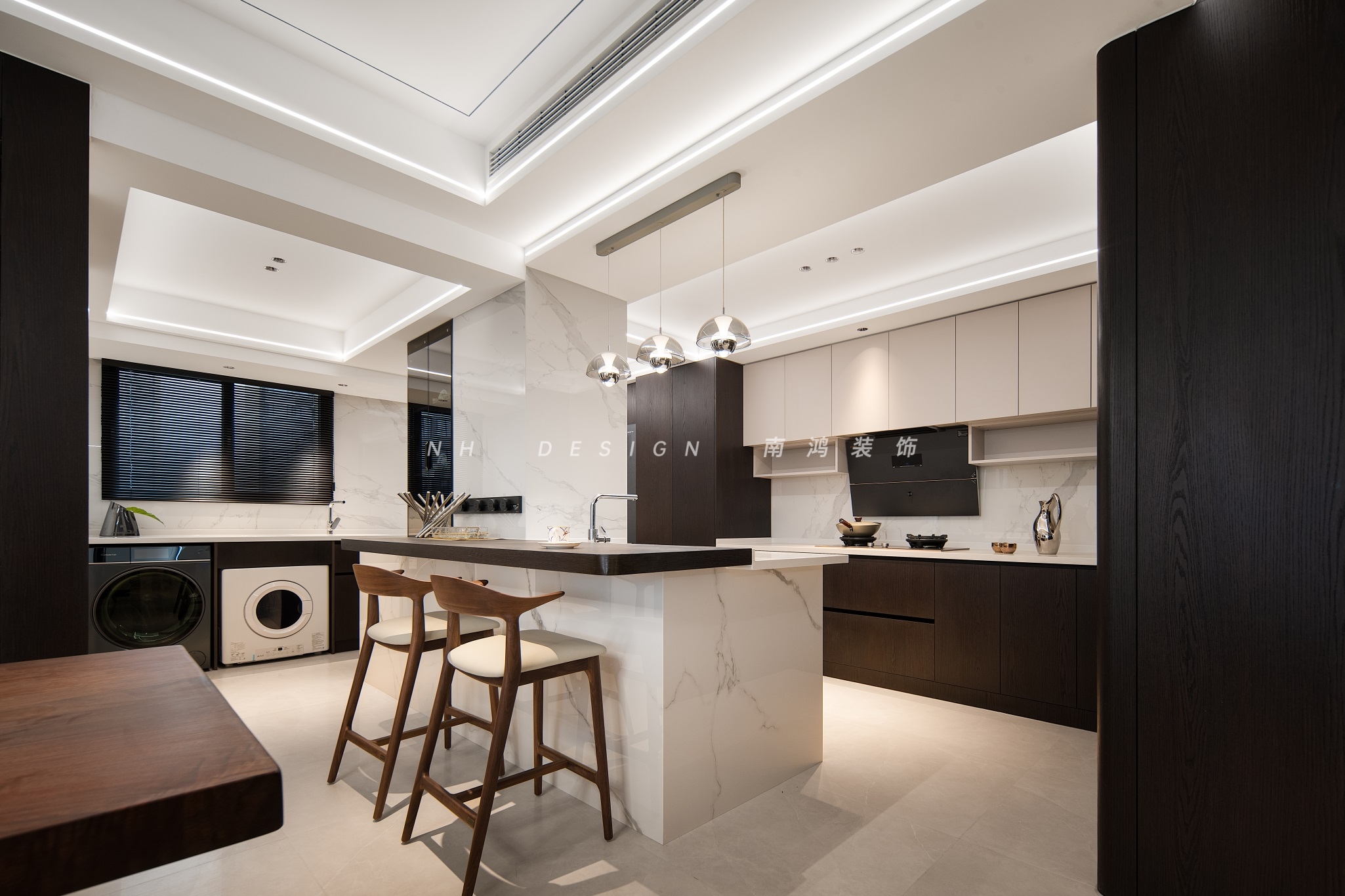 厨房和储物间打通并利用中央大岛台做过渡,岛台外侧做了抬高,搭配高脚凳秒变休闲吧台使用。开放式厨房操作台以L型展开,地柜嵌入洗衣机烘干机,家务动线变得无比高效。