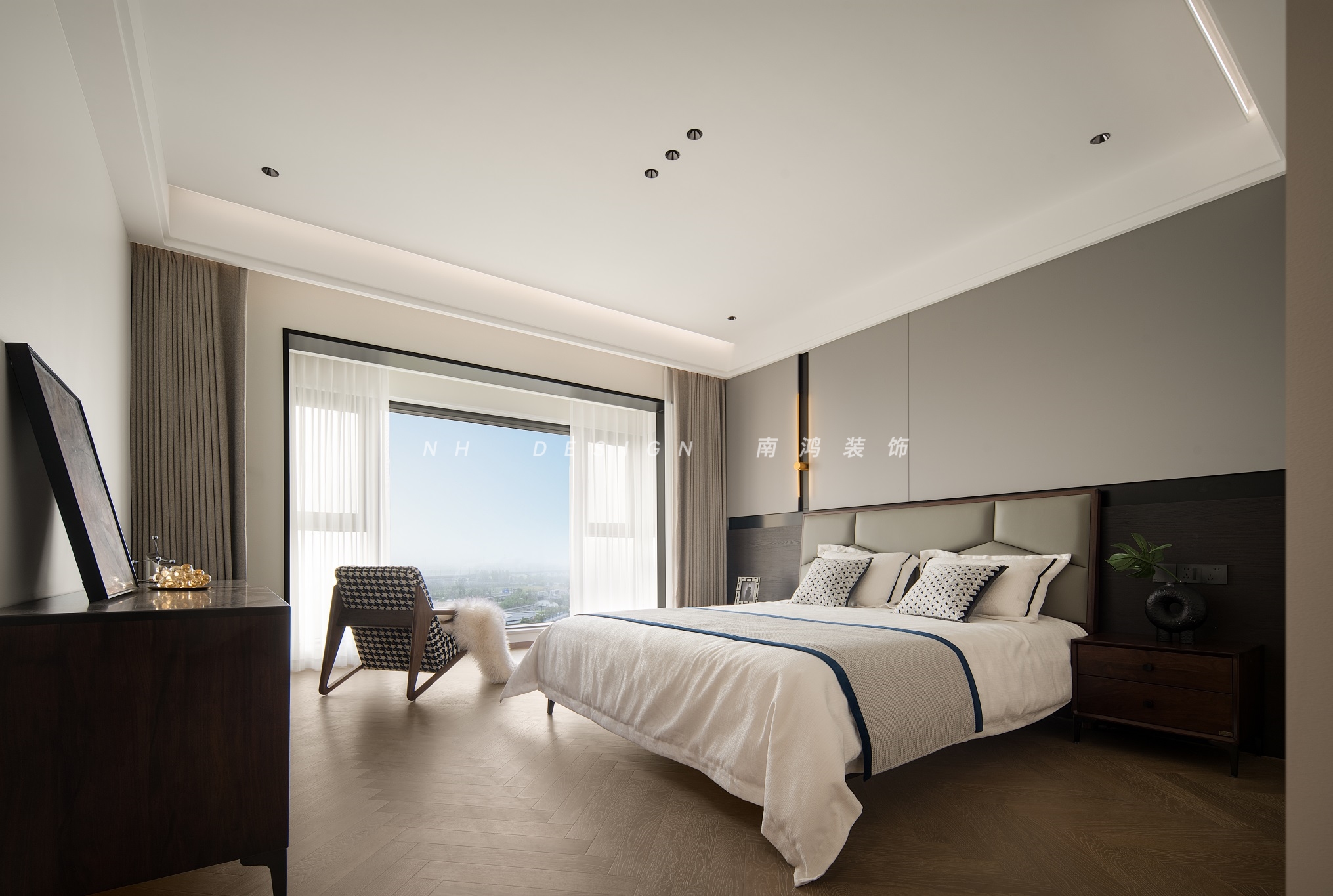 主卧以简洁利落的笔法勾勒轮廓,背景墙通过不同材质的拼接组合,构成一幅纵横交错的立体视觉图,丰满了空间层次。灰系基底与儒雅木质对话,也令空间在理性克制中透出更多的温度。