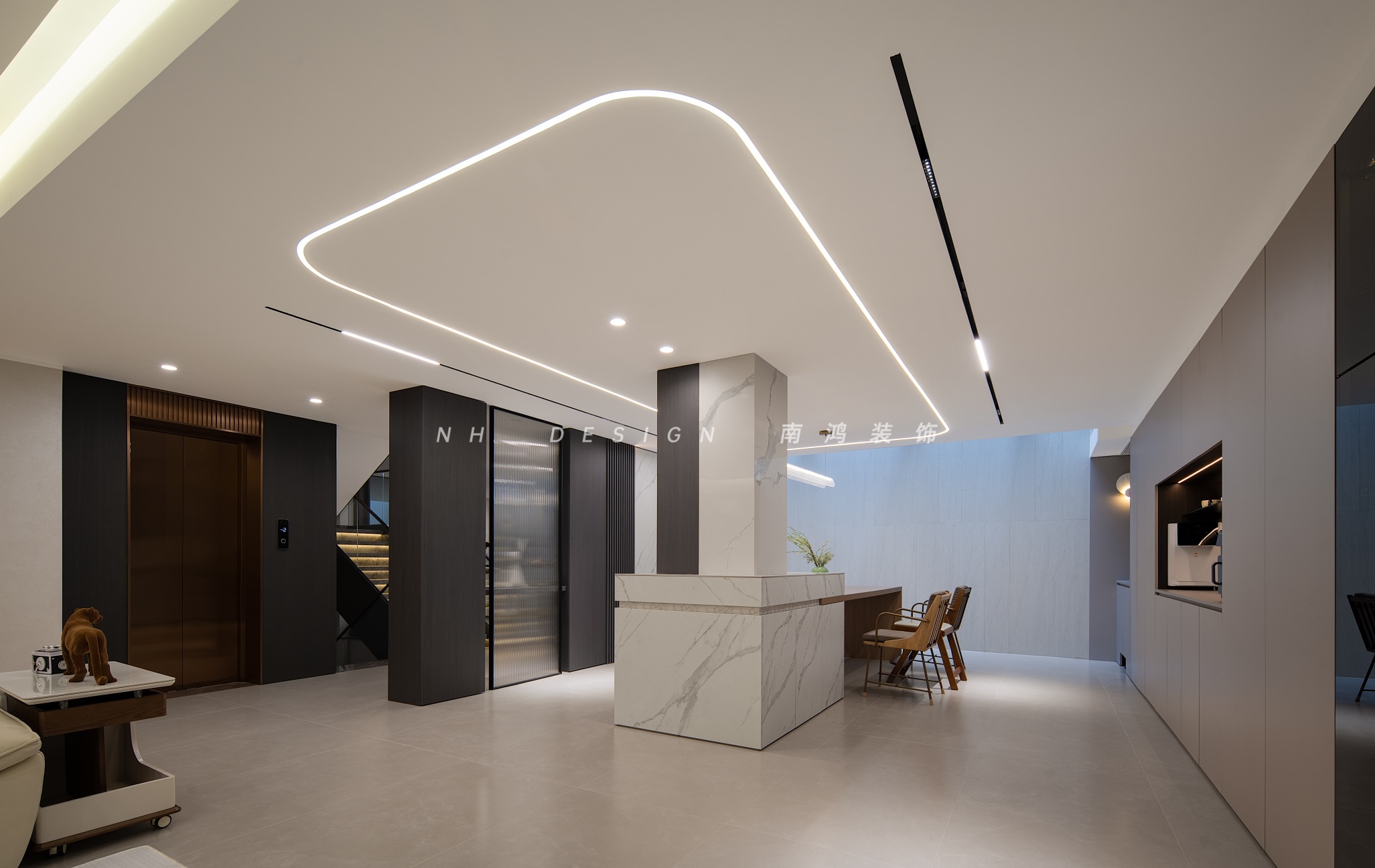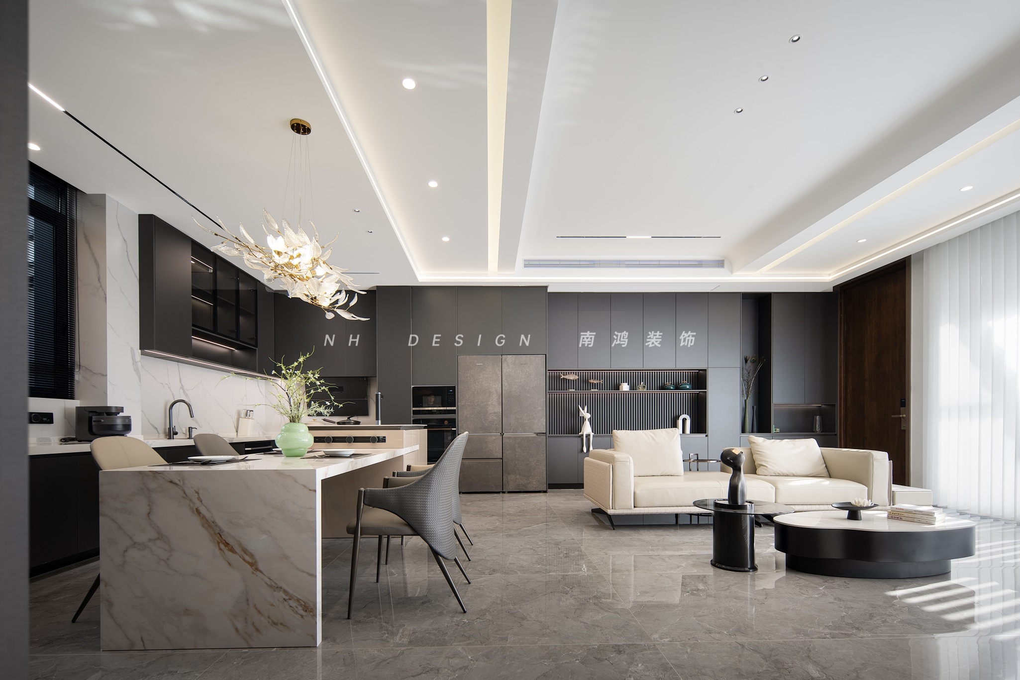 白色梦幻帘揽入诗意光景,深黑色饰面与天然大理石碰撞,描摹出轻奢风底色。又定制整面多功能收纳柜,玄关柜、餐边柜、沙发背柜三位一体,通过模块化的形式,打造严谨储纳秩序。高低错落的分割比例,也有力破除了大体量柜体的压抑感,表达符合人体工程学的取物逻辑。