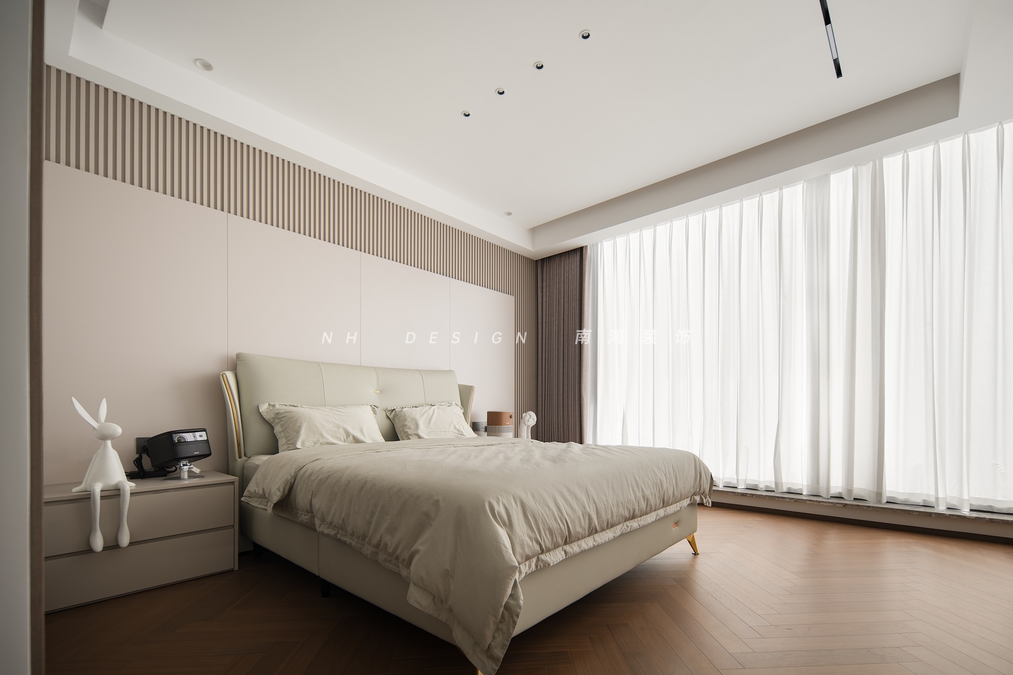 主卧使用简练线条与温润色彩,浅色木格栅基底传递朴实的自然意趣,亦于竖向拉伸了尺度,材质的组合同步勾勒出立体层次。