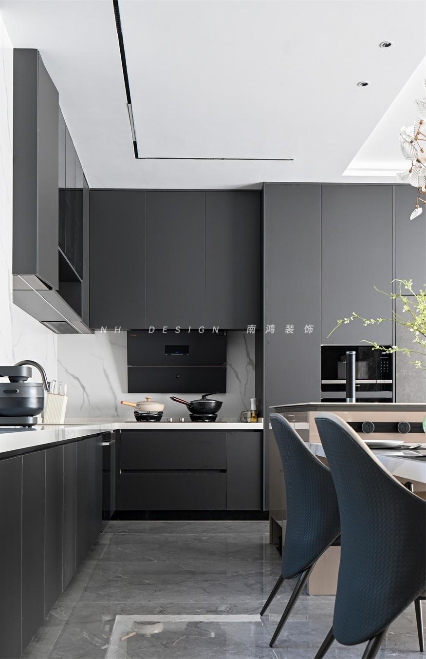 白色天然石材台面与哑光黑饰面构成鲜明对比,流畅动线也让日常的备餐、烹饪、就餐实现高效闭环,嵌入式厨电配合隐藏式收纳系统,赋予空间极清爽的外在。